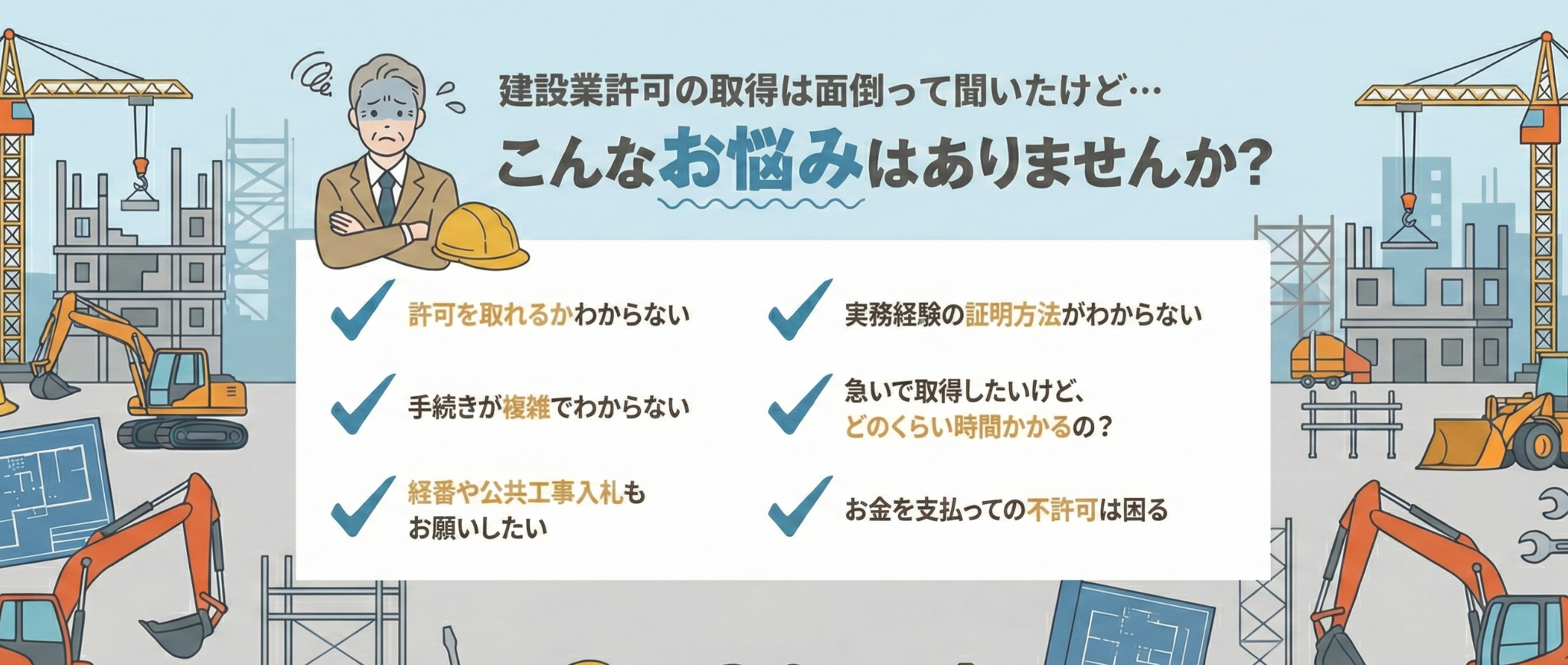 「何から手をつけていいか分からない」「必要な書類を集める時間がない」「自分は許可の要件を満たしているだろうか?」