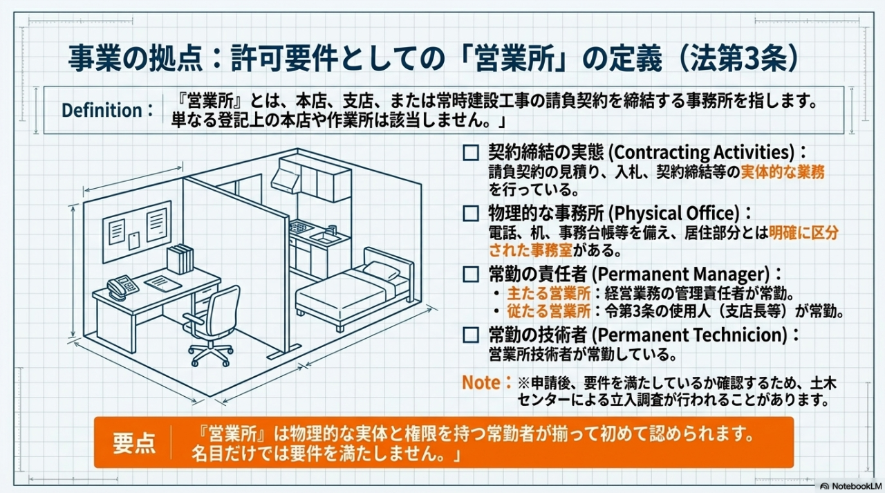 建設業の営業所として認められるには、「契約締結の実態」と「物理的な実体」が必要です。