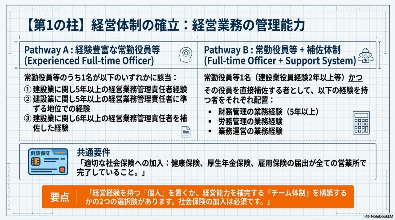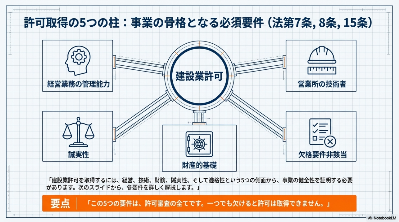 建設業許可を取得するためには、建設業法で定められた5つの要件(許可の5本柱)をすべて満たす必要があります。これらは一つでも欠けると許可は下りません。