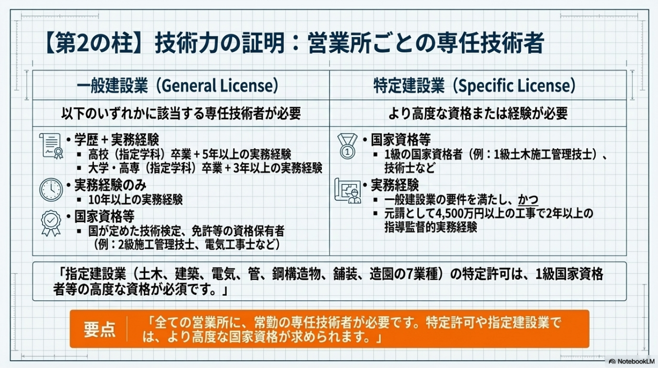※指定建設業(土木、建築、電気、管、鋼構造物、舗装、造園)で特定許可を取る場合は、必ず1級資格等が必要です(実務経験のみでは不可)。